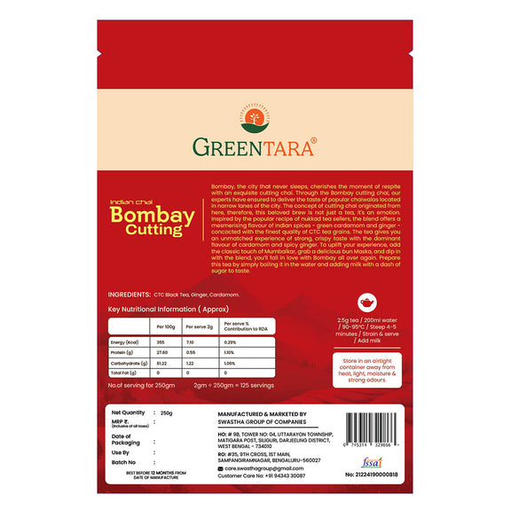 Bombay, the city that never sleeps, cherishes the moment of respite with an exquisite cutting chai. Through the Bombay cutting chai, our experts have ensured to deliver the taste of popular chaiwalas located in narrow lanes of the city. The concept of cutting chai originated from here, therefore, this beloved brew is not just a tea, it's an emotion. Inspired by the popular recipe of nukkad tea sellers, the blend offers a mesmerising flavour of Indian spices - green cardamom and ginger - concocted with the finest quality of CTC tea grains. The tea gives you an unmatched experience of strong, crispy taste with the dominant flavour of cardamom and spicy ginger. To uplift your experience, add the classic touch of Mumbaikar, grab a delicious bun Maska, and dip in with the blend, you’ll fall in love with Bombay all over again. Prepare this tea by simply boiling it in the water and adding milk with a dash of sugar to taste.